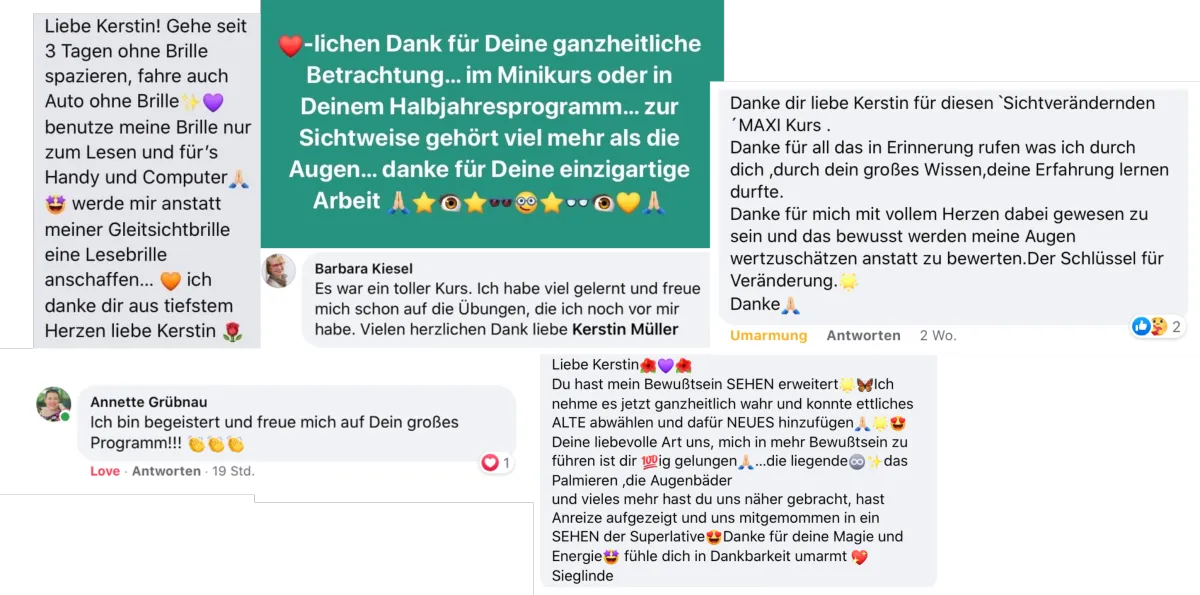 Wir ziehen gemeinsam mit den Teilnehmern in eine private „Volle Sehkraft“ Facebook-Gruppe und können uns dort näher kennenlernen. Zooms, Vorträge, Übungen, Zeit für Fragen und vieles mehr!