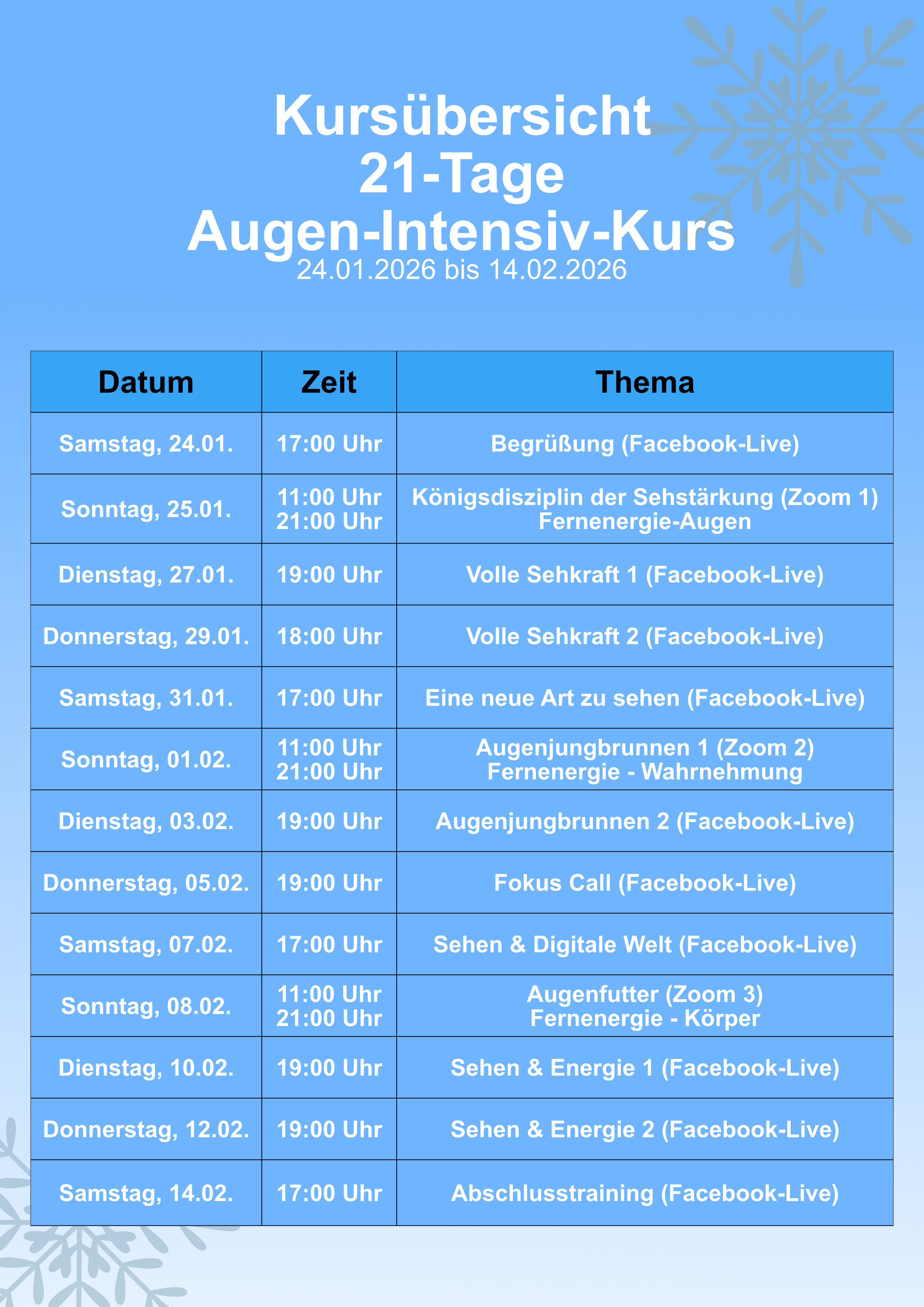 Dieser Kurs „Volle Sehkraft“ ist ein 21-Tage-Programm für alle, die ihre Sehkraft auf ein neues Level heben möchten, ihre Augengesundheit natürlich stärken, sowie MehrBlick schaffen möchten.